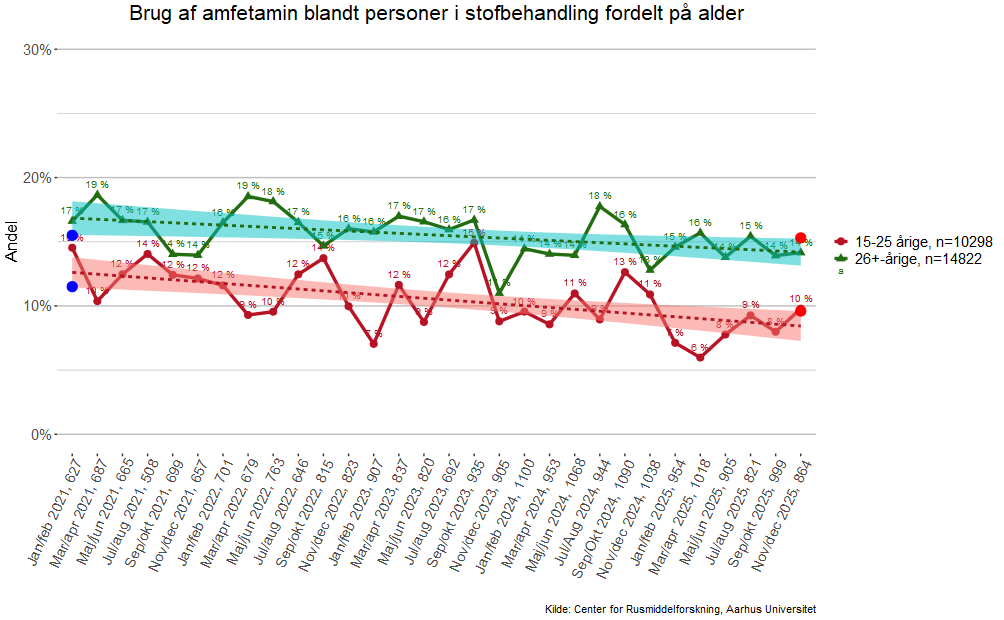 Grafen viser andelen af hhv. 15-25-årige og 26+-årige, som har brugt amfetamin i måneden op til, de begyndte i stofbehandling. Forbruget af stoffer bliver afdækket i det første interview i behandlingen - Map-interviewet.