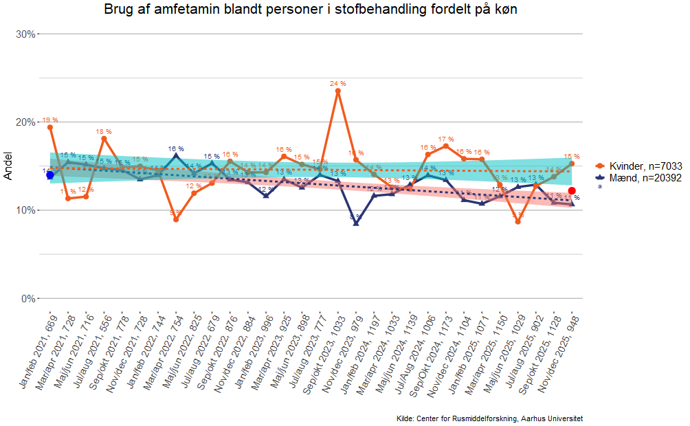 Grafen viser andelen af kvinder og mænd, der har brugt amfetamin i måneden op til, de begyndte i rusmiddelbehandling. Forbruget af stoffer bliver afdækket i det første interview i behandling - Map-interviewet.