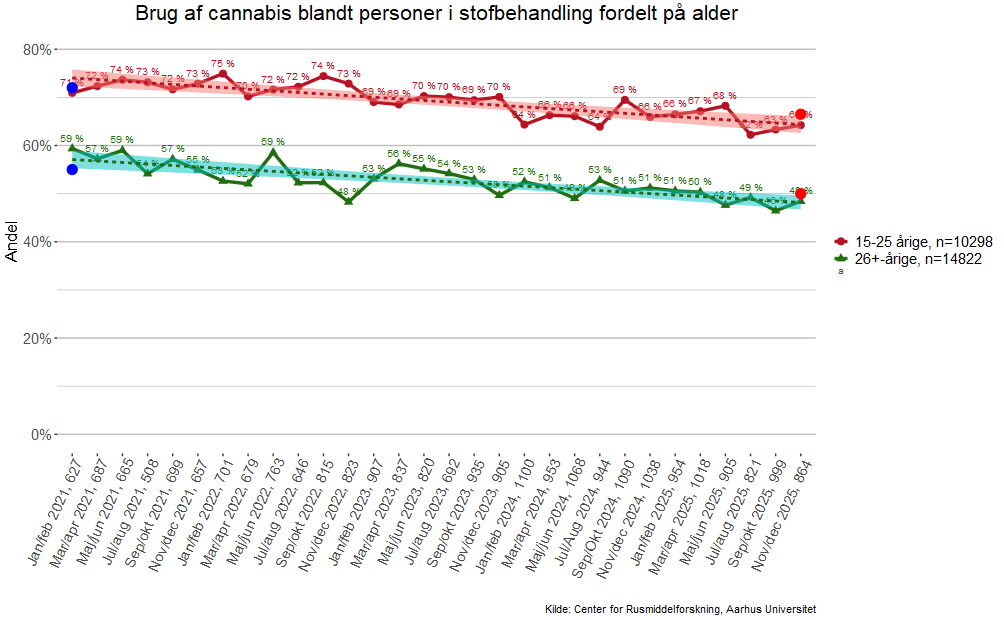 Grafen viser andelen af hhv. 15-25-årige og 26+-årige, som har brugt cannabis i måneden op til, de begyndte i stofbehandling. Forbruget af stoffer bliver afdækket i det første interview i behandlingen - Map-interviewet.