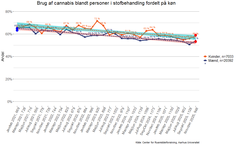 Grafen viser andelen af kvinder og mænd, som har brugt cannabis i måneden op til, de begyndte i stofbehandling. Forbruget af stoffer bliver afdækket i det første interview i behandlingen - Map-interviewet.