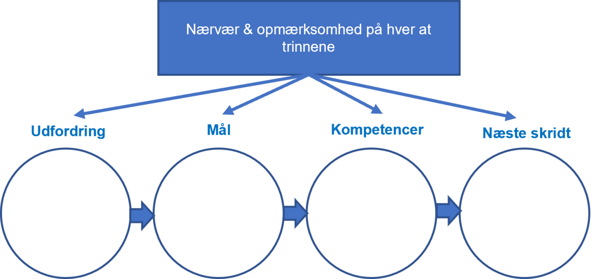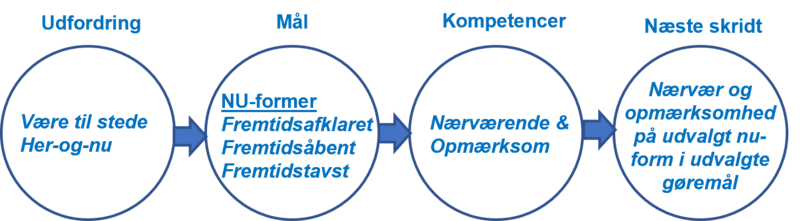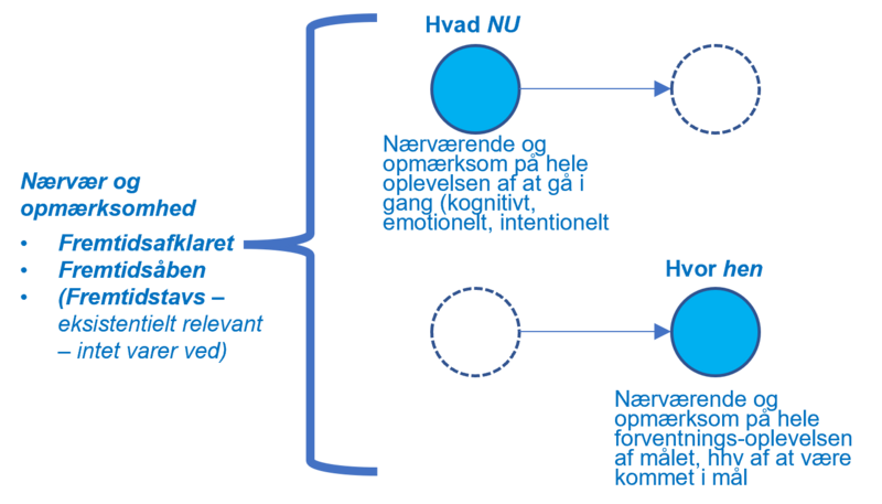 At være fremtidsrettet betyder ikke nødvendigvis, at vi åndeløst skal jage resultater hele tiden, eller at vi skal være præstations- og perfektionsorienteret i en evig utilfredshed med det, vi er og har. Faktisk tværtimod. Det er et nærværende og opmærksomt engagement her-og-nu på, hvilken slags proces man selv og sammen med andre er midt i og selv kan former til et næste nu eller til en (fælles) fremtidig tilværelse på sigt.